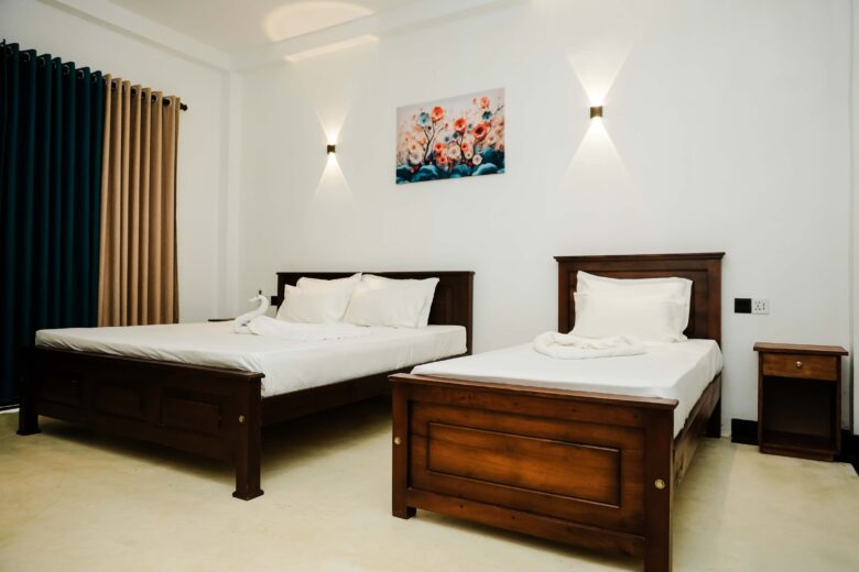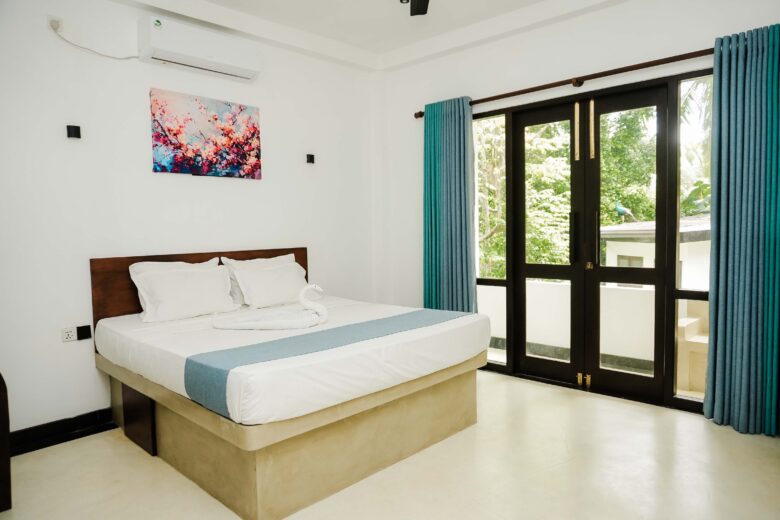 Room 2 is a spacious, stylish room surrounded by tropical greenery near Unawatuna Beach. Accommodating up to three guests, it offers calming garden views, comfortable furnishings, and a private bathroom for a relaxing stay, ideal for friends or families.